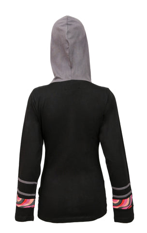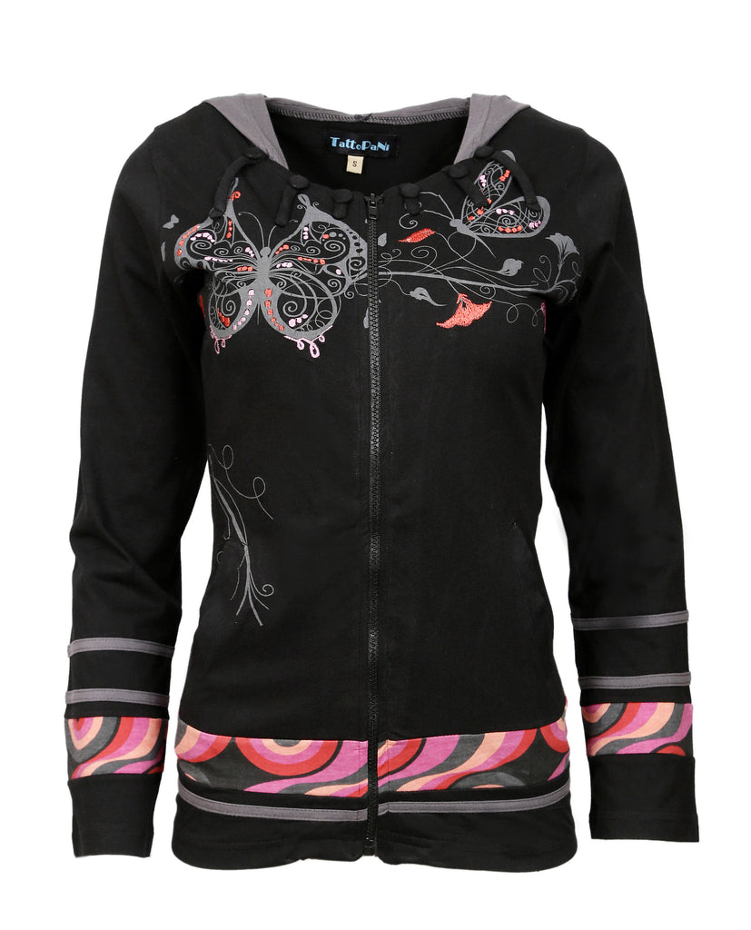 Ladies Black Slim Fit Long Sleeve Sinker Jacket with Colorful Butterfly Print. Beautiful floral embroidery, thin light weight outwear with attach hood. Pair them with Jeans, skirt or legging; and get to go for, perfect Autumn walk, casual gathering event. For all seasons!!!