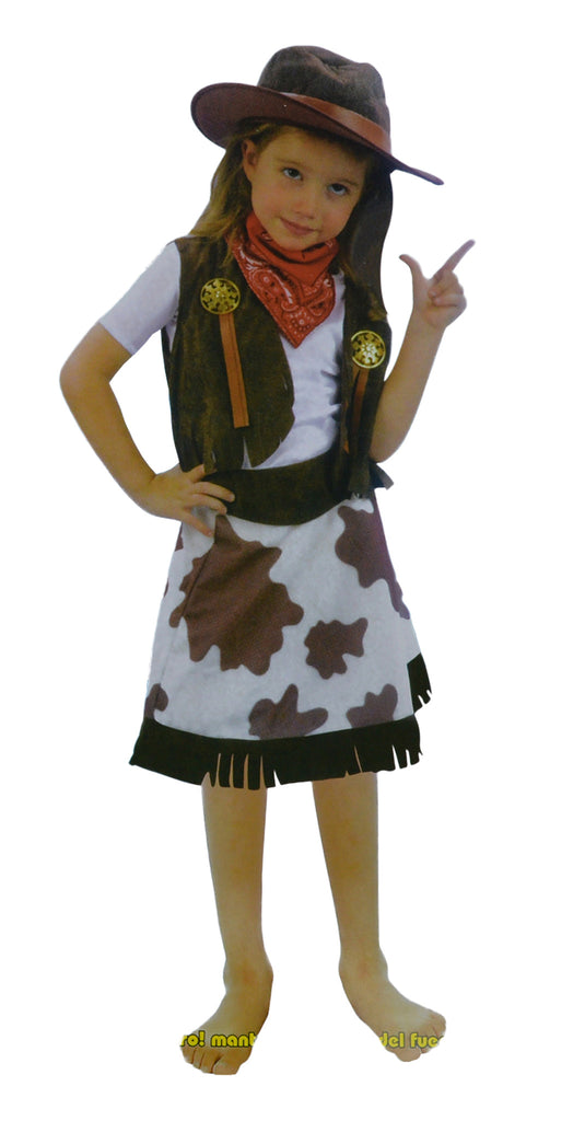 A cute Cowboy Fancy Dress. Chaps in brown & white cow print design with brown vest, matching hat & red bandanna. Add some of our great cowgirl accessories to complete your Cowgirl Fancy Dress.