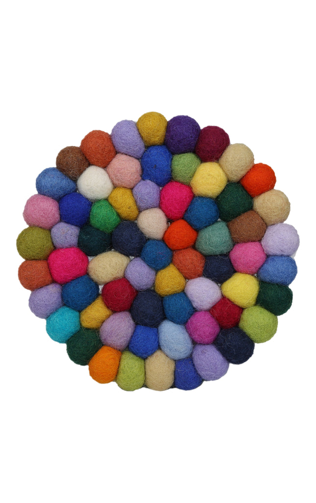 Colorful felt ball coaster and trivet approx. size of 15 diameter and 2 height, Finest quality hand dyed with individually chosen colors and compressed by hand in each color ball and then sewed individual color in strong nylon sting. Colors are 100% fastness and guaranteed. It is soft, smooth and warms. Its light color combination will add style and color stand out in any room. It fits anywhere in your bedroom or living room or in office room
