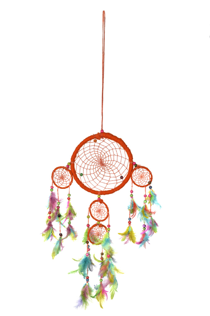 Dream Catchers are a Native American tradition which derives from their beliefs that both good and bad dreams fill the night air. By hanging a dream catcher near your bed, the bad dreams are caught in the web and perish with the first light of the new day. The good dreams however, know how to pass through and slide down the soft feathers to the sleeping person in the room.The dream catcher may also include sacred items such as certain feathers or beads.Multicolored dream catcher with loop for hanging.Made with natural dyed feathers.It is a lovely and interesting addition to your home decor, be it in the bedroom, living room, hall or conservatory.